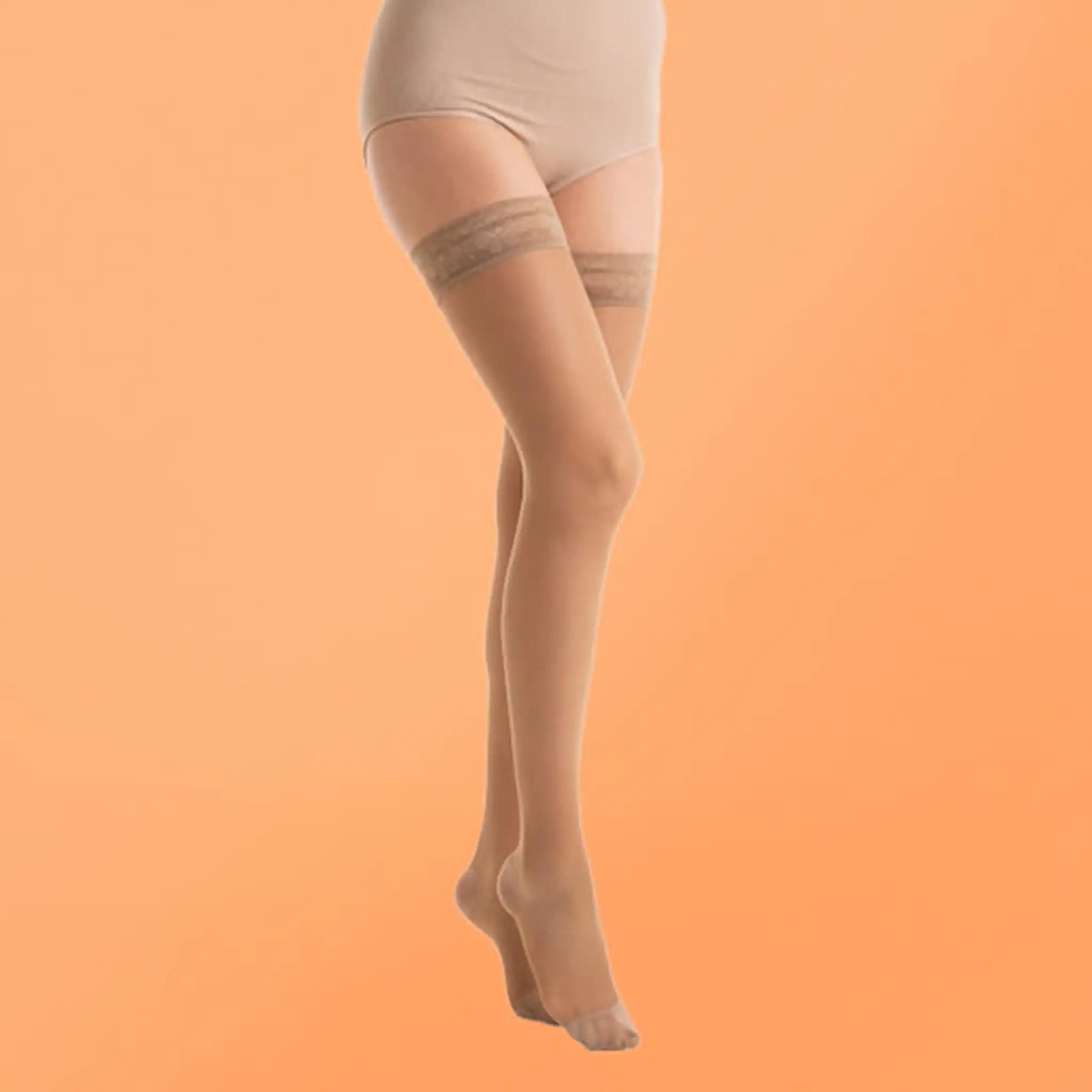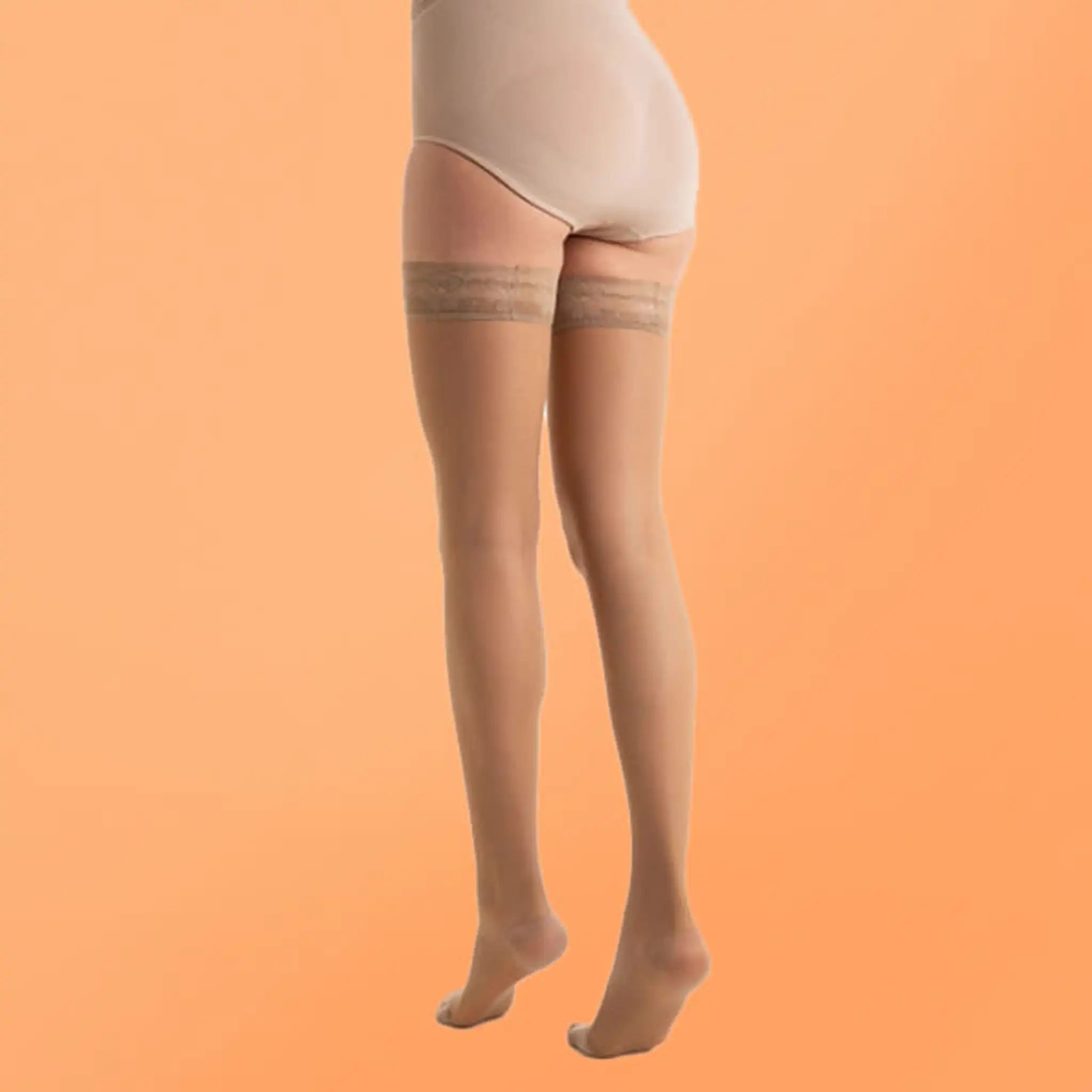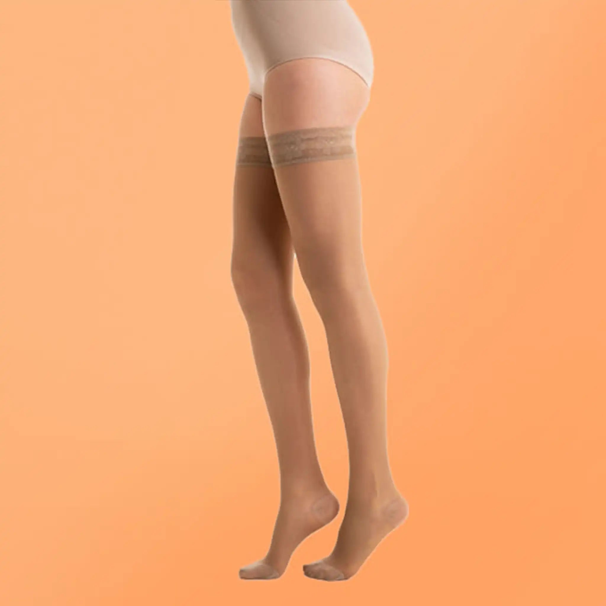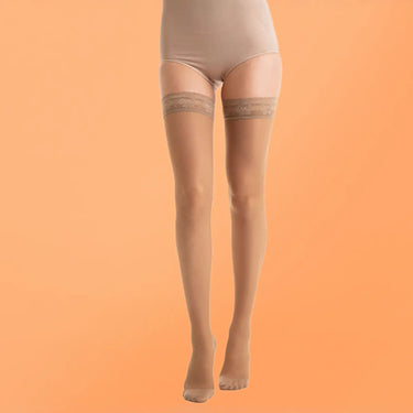Calze Preventive leggera compressione graduata 10-15 mmHg. Indicata per problemi circolatori leggeri, tendenza alle vene varicose e per le donne in gravidanza. Maglia Rete - 83% Poliammide, 17% Elastan. Balza elastica fantasia con silicone , rimane ben salda alla coscia donando sempre comfort.